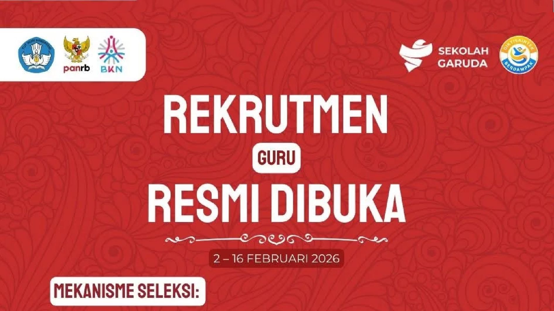 WartaPendidikan.co.id, JAKARTA, 3 Februari 2026 – Pemerintah resmi membuka pendaftaran seleksi Guru Pegawai Pemerintah dengan Perjanjian Kerja (PPPK) khusus untuk ditempatkan di Sekolah Unggulan Garuda. Pendaftaran dibuka mulai 2 Februari hingga 16 Februari 2026 melalui laman resmi SSCASN.