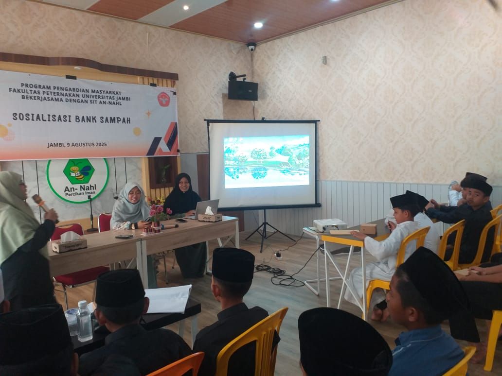 WartaPendidikan.co.id, Jambi – Tim dosen dari Fakultas Peternakan Universitas Jambi (UNJA) melaksanakan kegiatan Pengabdian kepada Masyarakat (PPM) bertajuk “Optimalisasi Pengelolaan Sampah Sekolah Melalui Pembentukan Bank Sampah di SIT An-Nahl Kota Jambi”. Kegiatan ini dipimpin oleh Ir. Wiwaha Amas Sumadja, MSc., PhD dengan anggota tim Prof. Hutwan Syarifudin, Dr. Ir. Nahri Idris, Dr. Bayu Rosadi, dan Heru Handoko, SPt., MSi.. Turut mendampingi pula praktisi bank sampah, Enung Komalasari, SH. dan Riska Ayu Wulandari.
