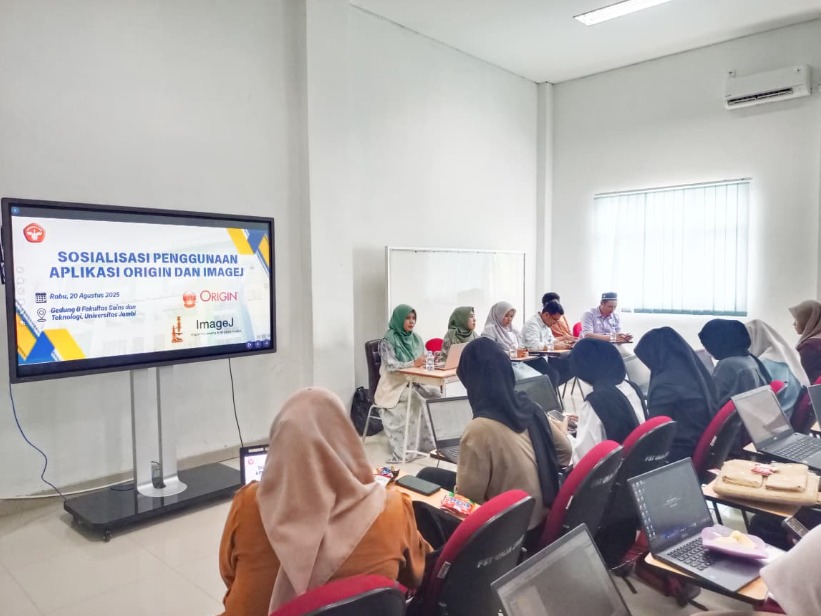 WartaPendidikan.co.id, Jambi – Program Studi Fisika Fakultas Sains dan Teknologi (FST) Universitas Jambi (Unja) sukses menyelenggarakan kegiatan pengabdian kepada masyarakat (PKM) dengan fokus pada peningkatan kemampuan analisis data bagi mahasiswanya. Kegiatan bertajuk “Sosialisasi Penggunaan Aplikasi Origin dan ImageJ untuk Analisis Sampel Material” ini telah dilaksanakan dengan lancar pada hari Rabu, 20 Agustus 2025, bertempat di Aula Gedung B FST Universitas Jambi.