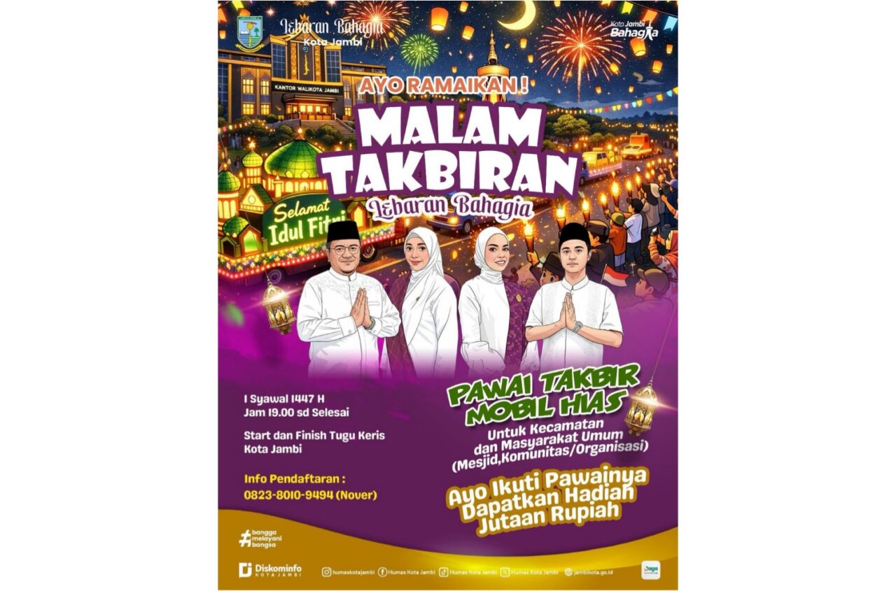 WartaPendidikan.co.id, Jambi – Menjelang Idul Fitri 1447 H,  Wali Kota Jambi, Dr. dr. H. Maulana, M.K.M., akan membuka langsung Pawai Takbir Keliling Mobil Hias yang menjadi ikon wisata religi tahunan. Titik utama pawai berada di Tugu Keris Siginjai, Kotabaru, Kota Jambi, Minggu (15/03/2026).