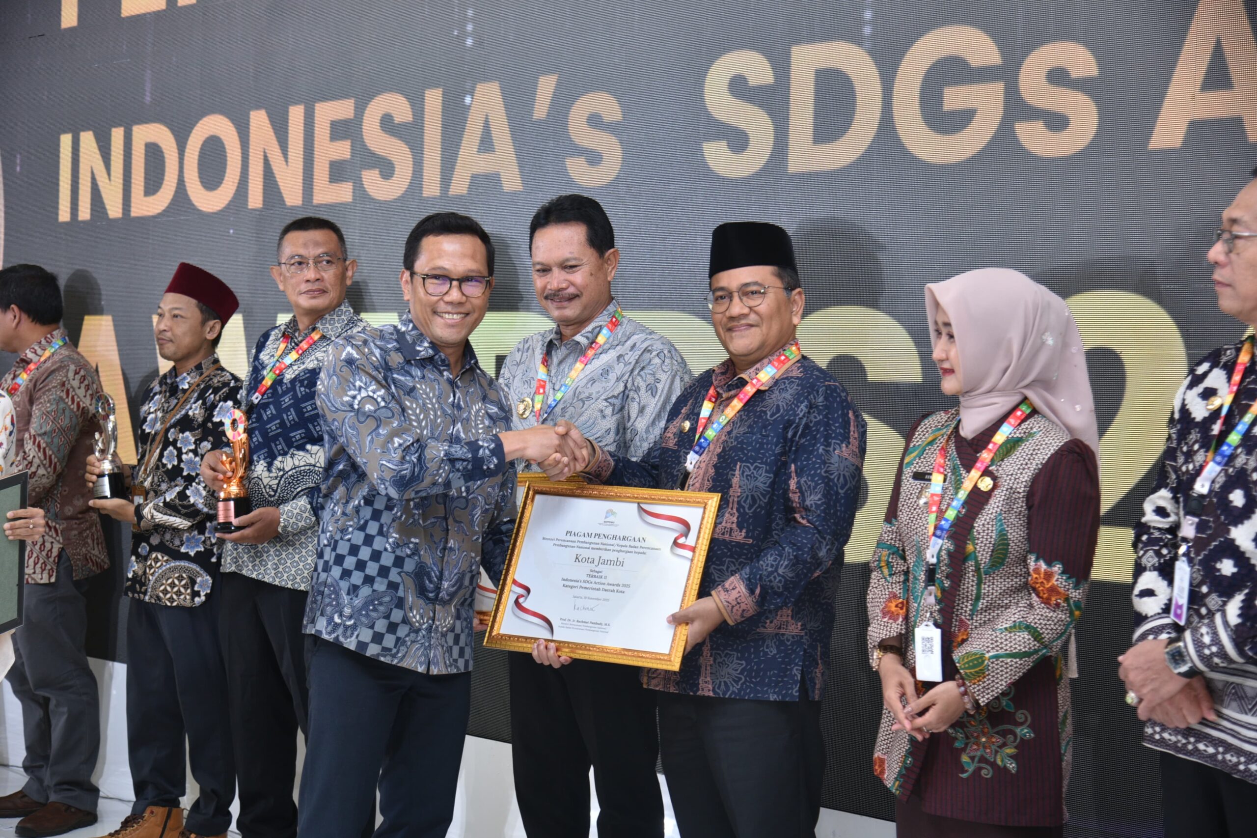 “Alhamdulillah, hari ini kami berada di Kantor Bappenas untuk menerima penghargaan Indonesian SDG Action Award kategori Pemda Kota sebagai terbaik II. Saya telah mempresentasikan LAGRO Kota Jambi pada tahap Top 5, dan hari ini Kota Jambi ditetapkan pada nomor urut 2 secara nasional,” ujar Wali Kota Maulana.
